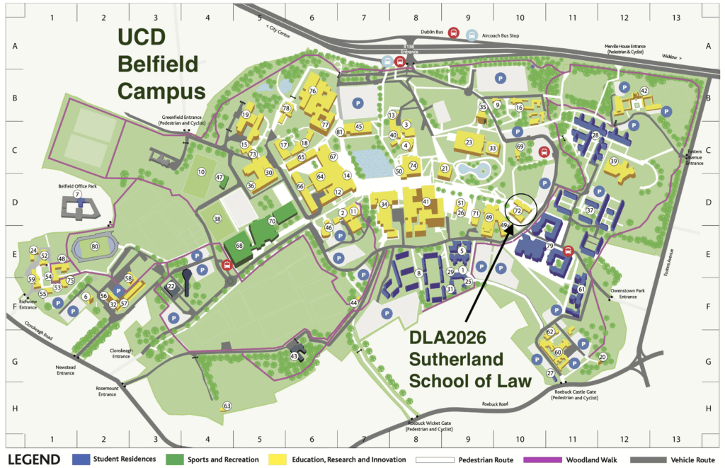 Maps DLA2026 will be held at the University College Dublin, Belfield campus (SE of Dublin city), at the Sutherland School of Law (SE quadrant of campus); see maps below: